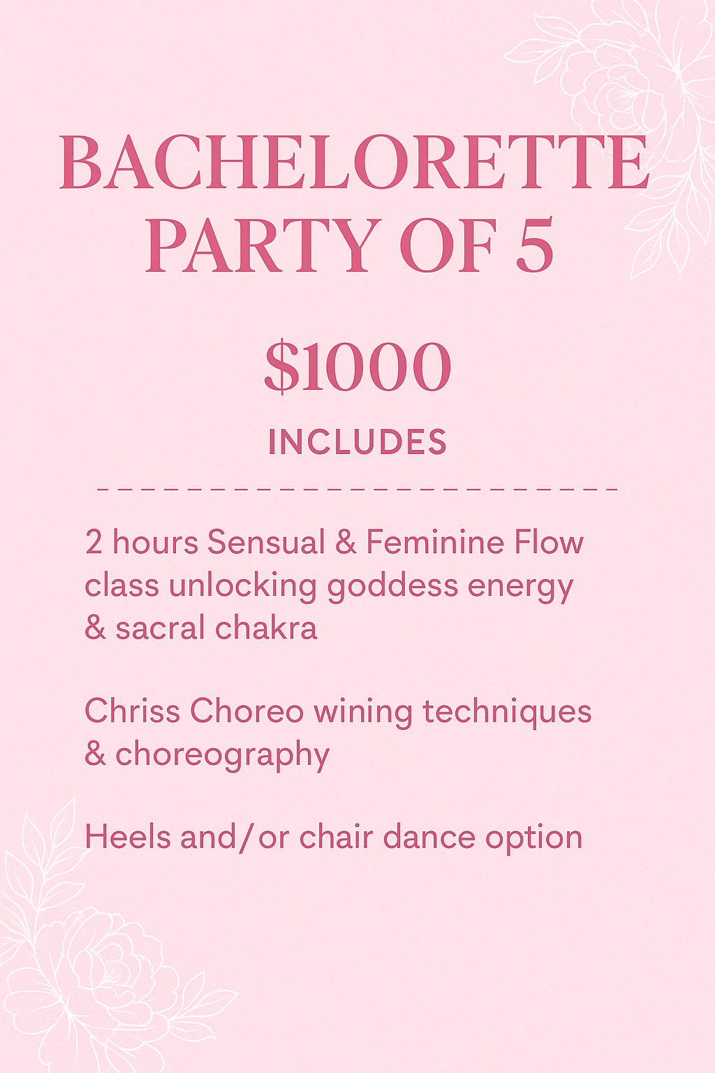 Unlock and unleash your sensual and feminine energy with our Bachelorette Party Package for 5! Join us for a 2-hour class focused on flowing movements that will activate your sacral chakra. Learn sensational choreography and even add in some heels and chair dancing upon request. Let us help you celebrate in style!