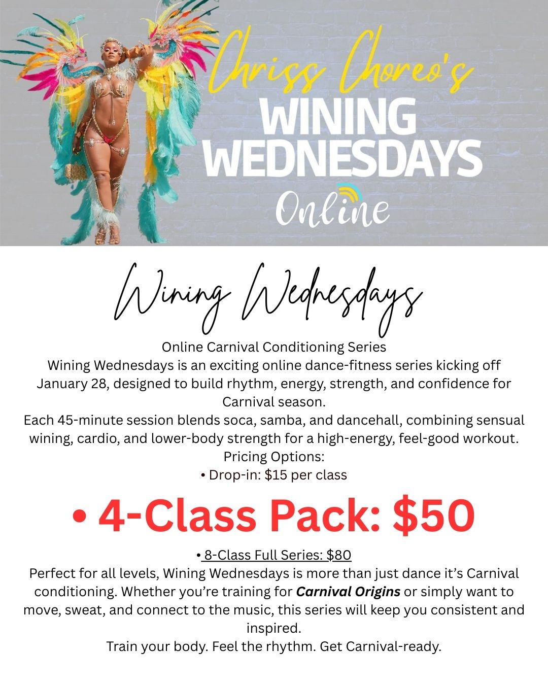 Wining Wednesdays is an exciting online dance-fitness series kicking off January 28, designed to build rhythm, energy, strength, and confidence for Carnival season.