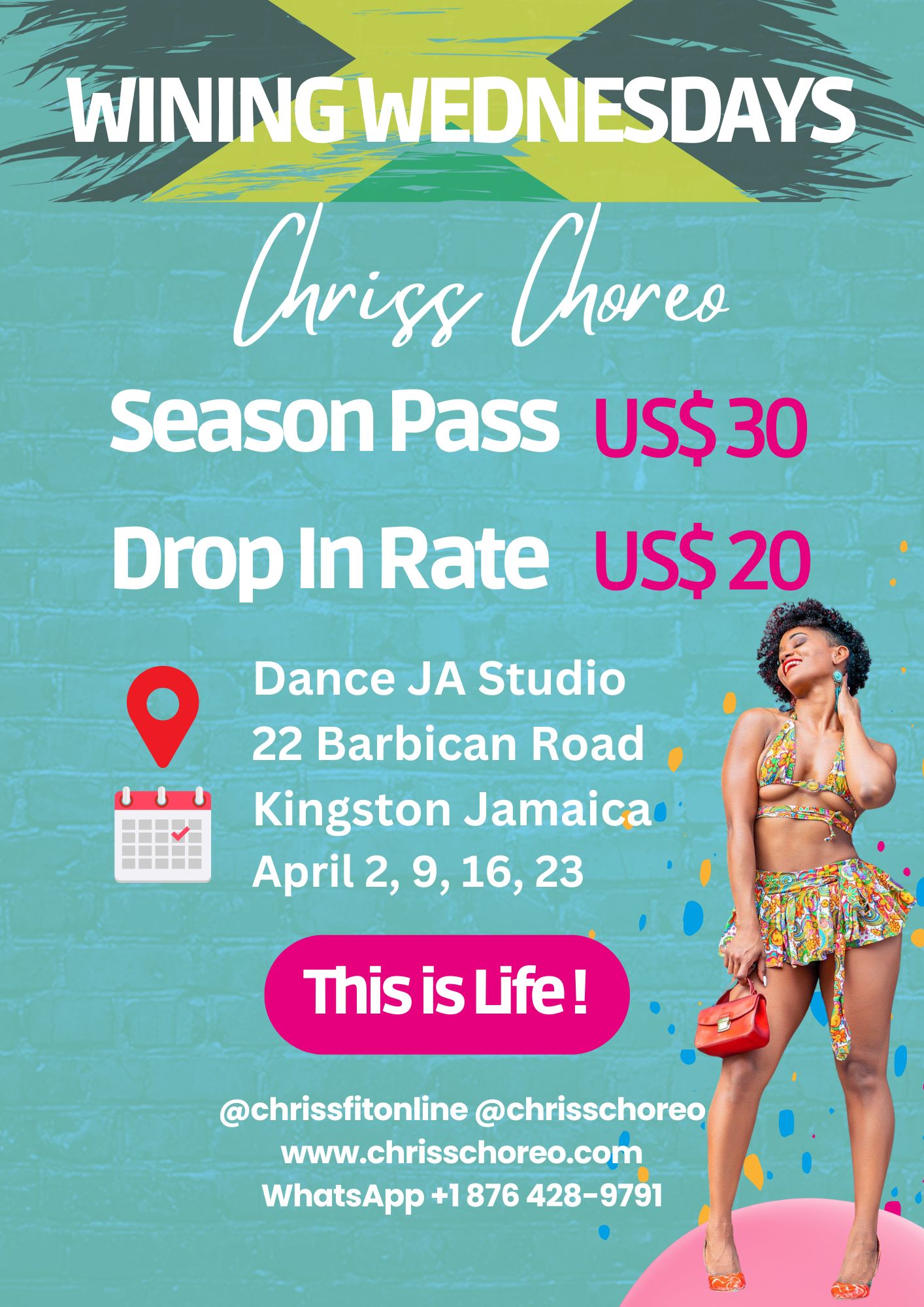 Enhance your feminine energy and flow with Wining Wednesdays' Chriss Choreo. Enjoy 4 days of sensuality featuring gyrations, basic heels dancing, and dancehall influenced moves. Save with our early bird package of only US$30 (About JA$4000) for a season pass or drop in for US$20 per person.